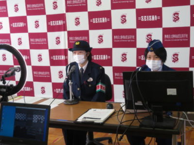 交通安全教室 2021年12月17日 全校生徒を対象にライブ配信による交通安全教室を行いました。 教室に配信された映像を見ながら、意識しないと見えない状況を体験したり、クイズに挑戦したり、工夫された内容で生徒達は交通ルールやマナーについて再確認することができました。